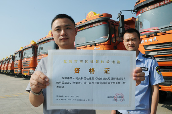 昨天下午,市城管局行政许可处和执法支队工作人员向中运物流有限公司发放了《盐城市市区建筑垃圾运输资格证》。中运物流有限公司的董事长曹群领告诉记者,公司先后投入了1000多万元对渣土车进行升级改造,改造21辆原有车辆,又新买了20辆,并且配备洒水车,加油车等。
