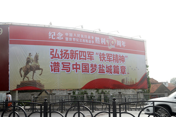 为隆重纪念中国人民抗日战争暨世界反法西斯战争胜利70周年,根据市委、市政府、市委宣传部和局领导的要求,市区开展抗战纪念系列活动,大力营造纪念抗战胜利和新四军抗战丰功伟绩的浓烈氛围,亮广中心全体员工放弃休息日,精心设计、加班加点,在市区建军路、世纪大道、开放大道等主要道路设置道旗400余杆,大型户外广告13块以及大型电子显示屏播放宣传“新四军东进凯歌,谱写英雄盐城”、“弘扬铁军精神,建设美丽盐城”的画面图展,为建设新盐城,发展上台阶共同谱写中国梦的盐城华彩篇章。