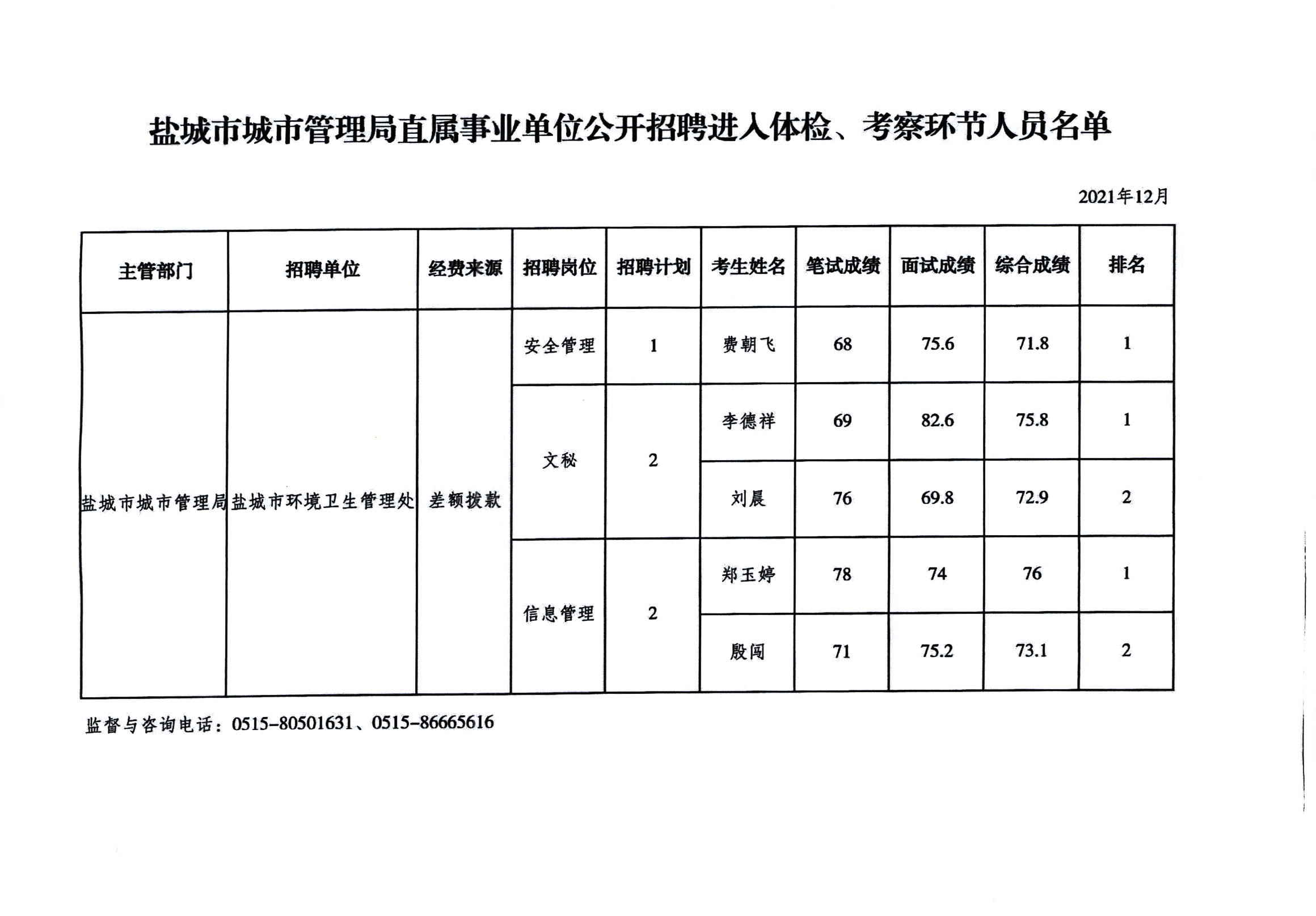 市城管局直属事业单位公开招聘进入体检、考察环节人员名单