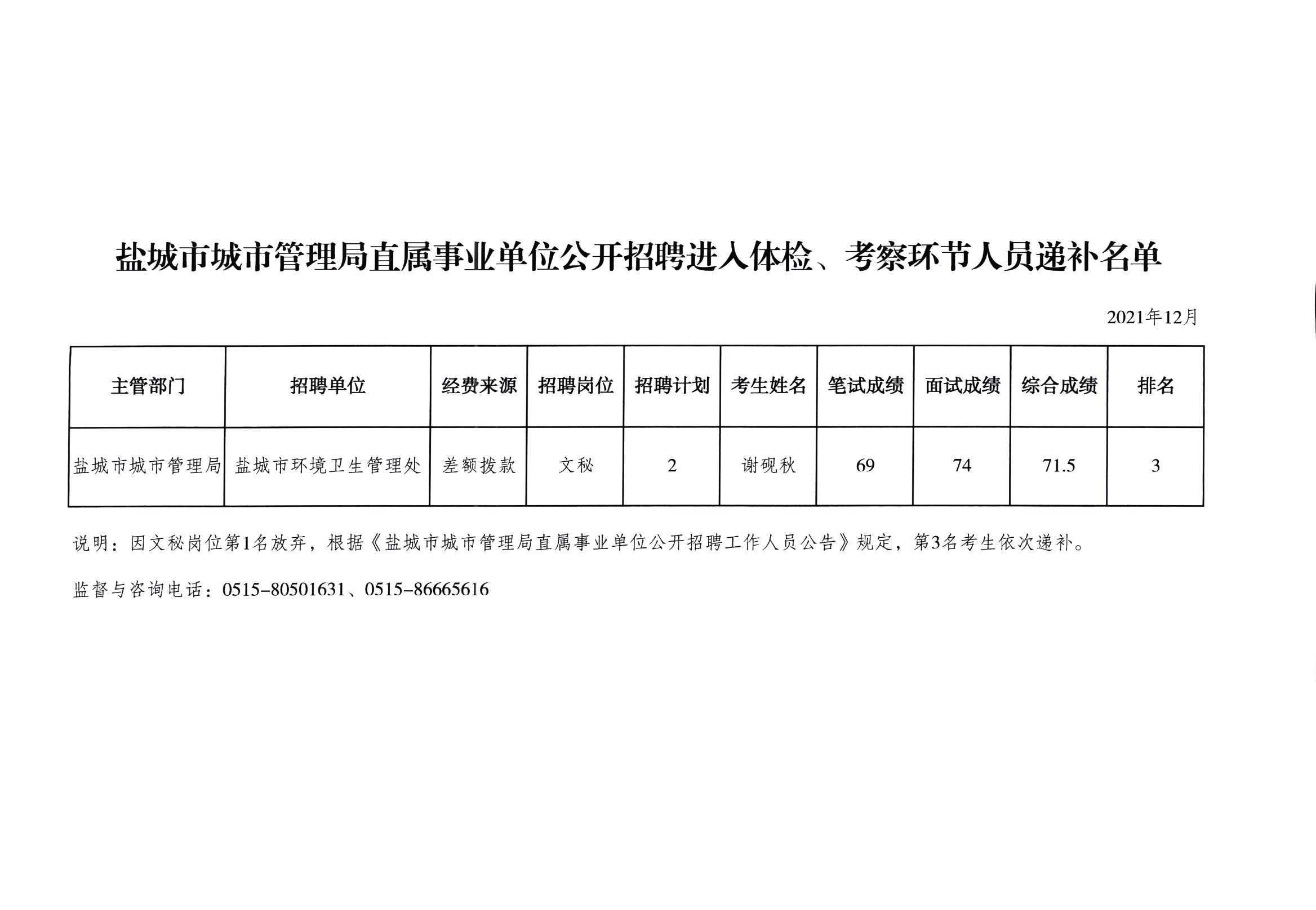 盐城市城市管理局直属事业单位公开招聘进入体检、考察环节人员递补名单