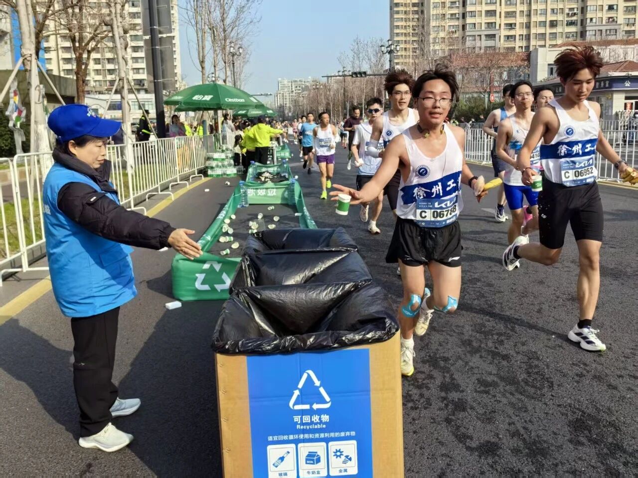 全维度服务赋能,以绿色理念彰显城市温度。赛事保障不止于硬核守护,更藏着城市的温情与暖意。绿色办赛的理念,贯穿赛事保障始终。在赛事起终点奥体中心设置了垃圾分类宣传点,憨态可掬的“垃圾分类”人偶,吸引了众多跑者、市民驻足合影,在轻松的氛围中把绿色理念传递给每一个人。同时,还在赛道沿线投放29组“垃圾三分类”收集箱,方便跑者途中分类投放,让垃圾分类成为赛事新风尚。绿色出行的暖心服务,让赛事保障更具温情。市城管局提前对接共享单车运营企业,在赛道沿线科学布设共享单车与电动自行车,安排专人做好车辆调度与秩序维护,全力保障选手、市民和游客的出行需求。此外,市城管局充分发挥城市宣传阵地作用,协调全市11 个县(市、区)60块大型LED屏播放赛事公益宣传海报,对28处直播点位进行安全检查和直播测试,营造了浓厚的赛事氛围。