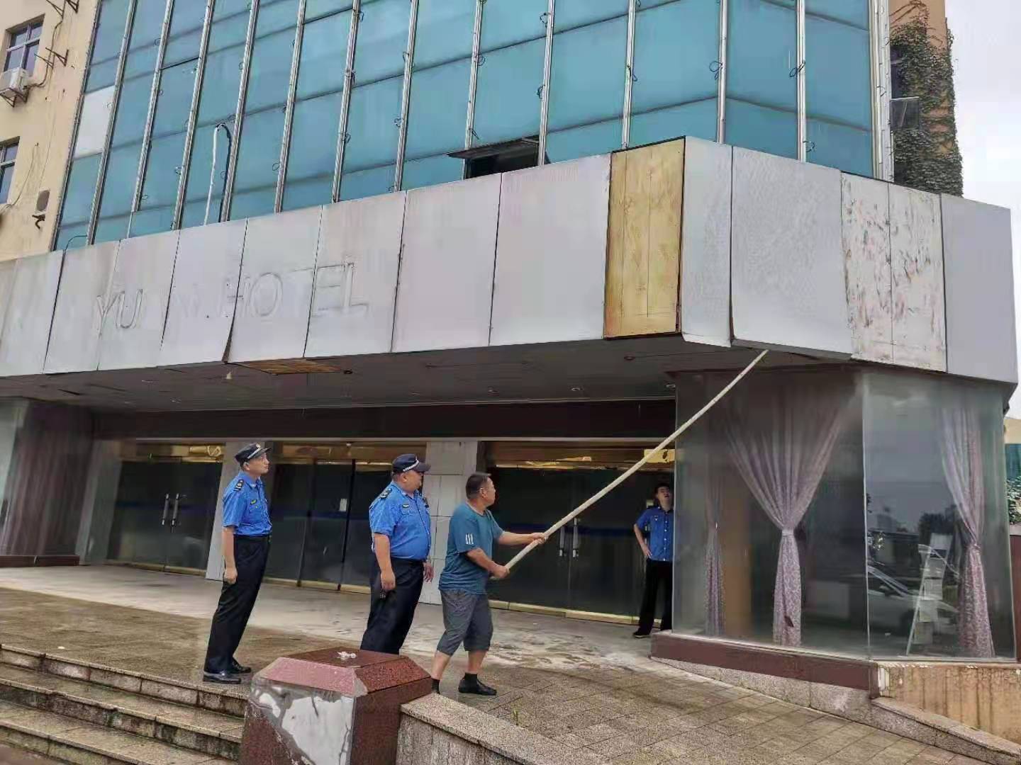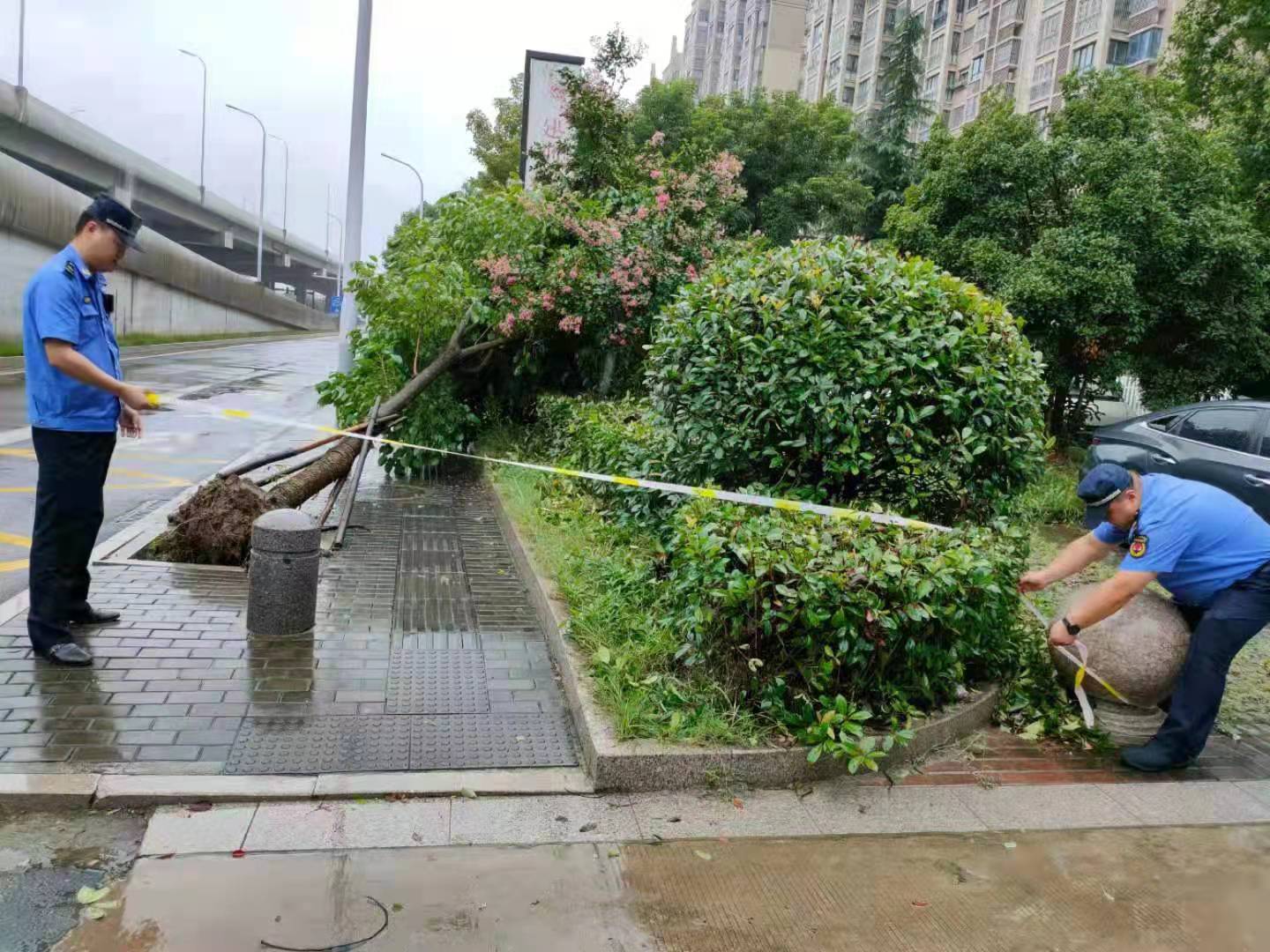 7月26日上午,世纪大道中队巡查时,发现青年中路原南苑宾馆门头铝塑板年久失修,板体剥落,立即要求有关单位拆除松动剥离的铝塑板,并对墙体进行加固,及时消除安全隐患。27日上午,西环南路中队巡查时,发现青年路青年华都南门两棵行道树、垃圾箱倒伏。执法人员立即扶起垃圾箱并拉起警戒绳现场警戒,联系园林部门重新栽树并加固,恢复原状。解放路与鹿鸣路交叉口西北角,树木被风刮倒,执法人员现场设置安全护栏,同时联系相关部门,前来及时修复。确保市民出行安全。