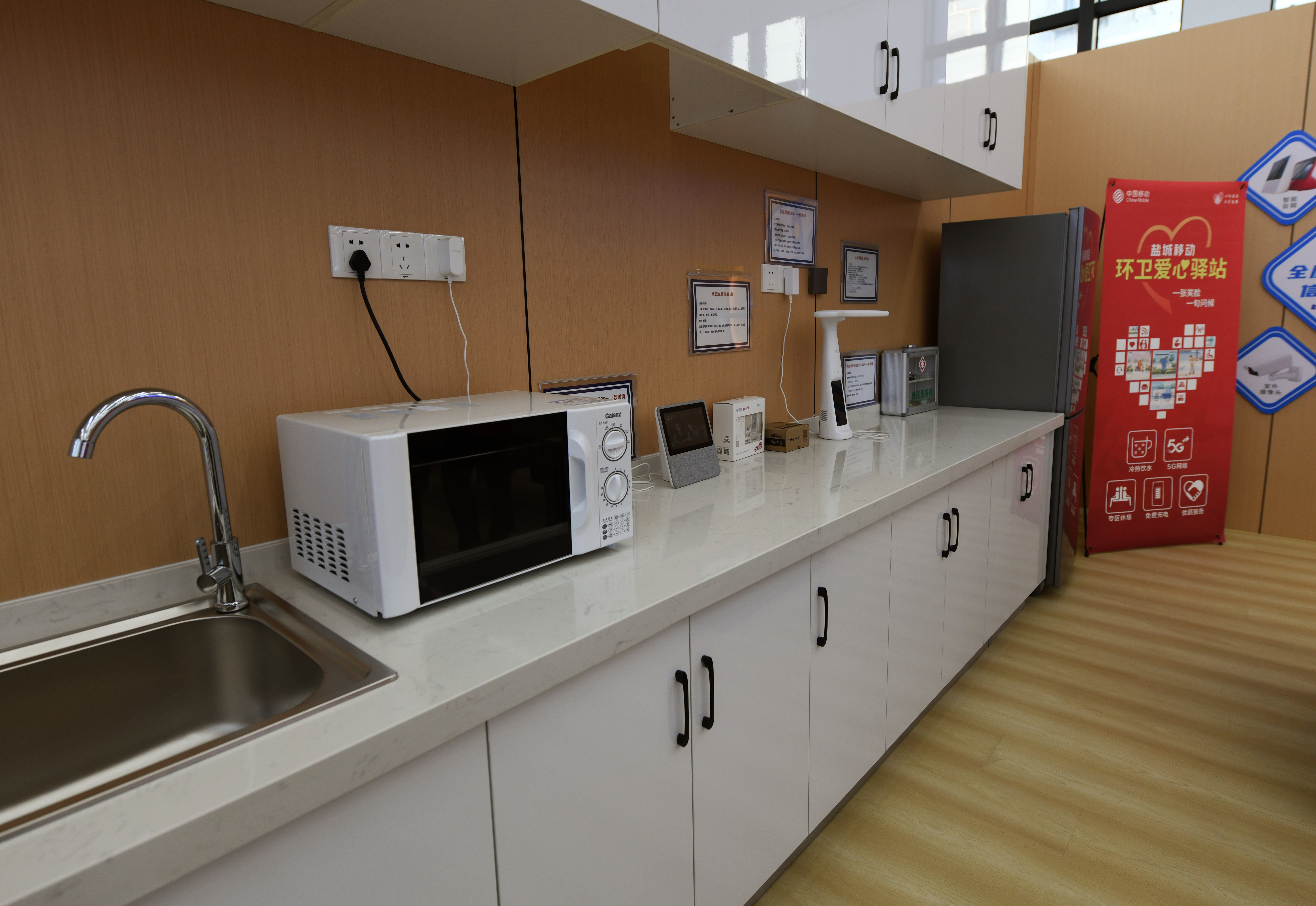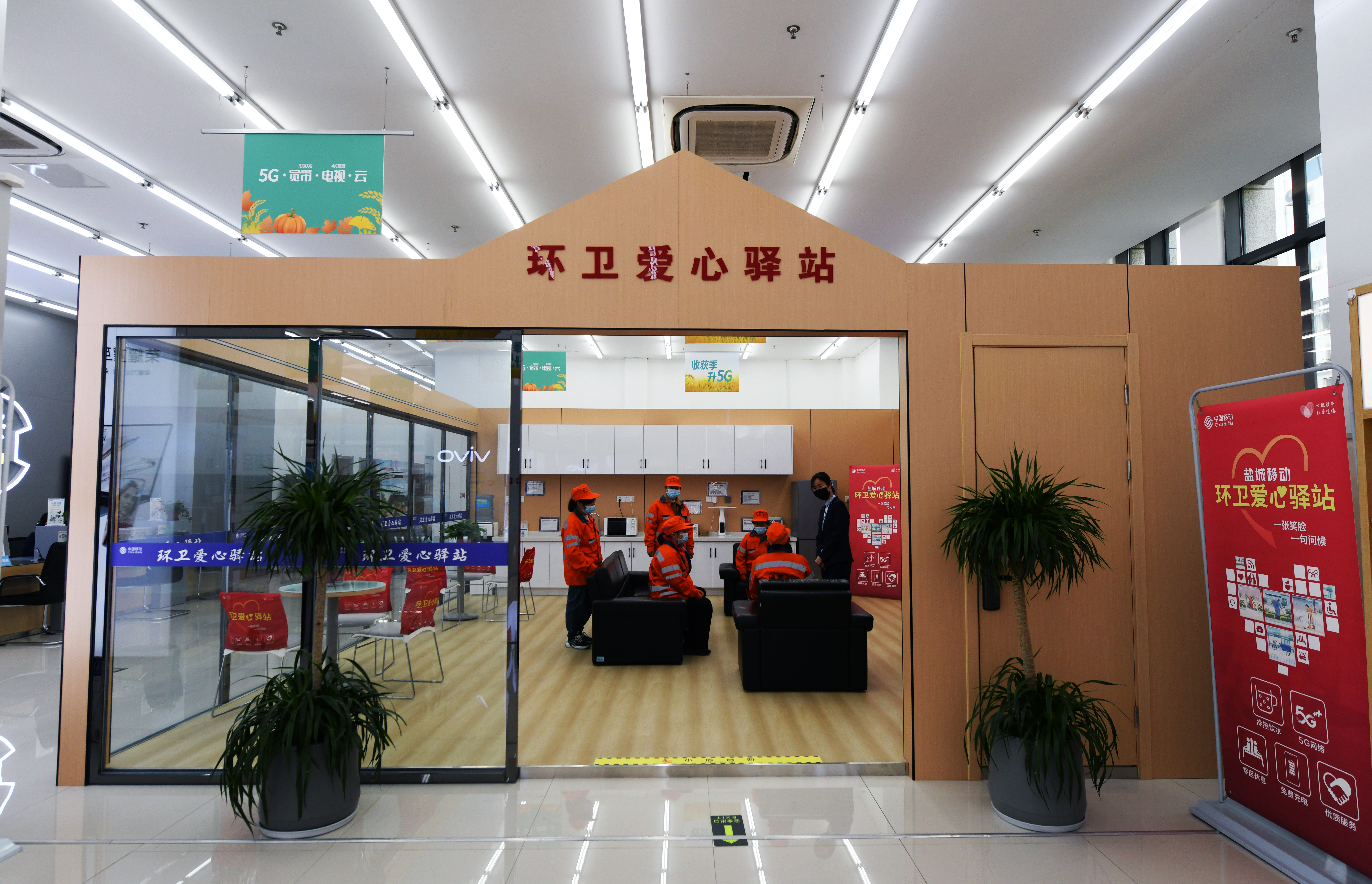 为给环卫工人提供暖心服务,盐城移动分公司利用自有移动营业厅积极建设“环卫爱心驿站”,免费提供沙发、爱心座椅、冷热饮用水、微波炉、冰箱、雨伞、便民箱等便利服务。后期将在全市设立移动“环卫爱心驿站”234家,实现移动网点全覆盖,惠及一线环卫工人。