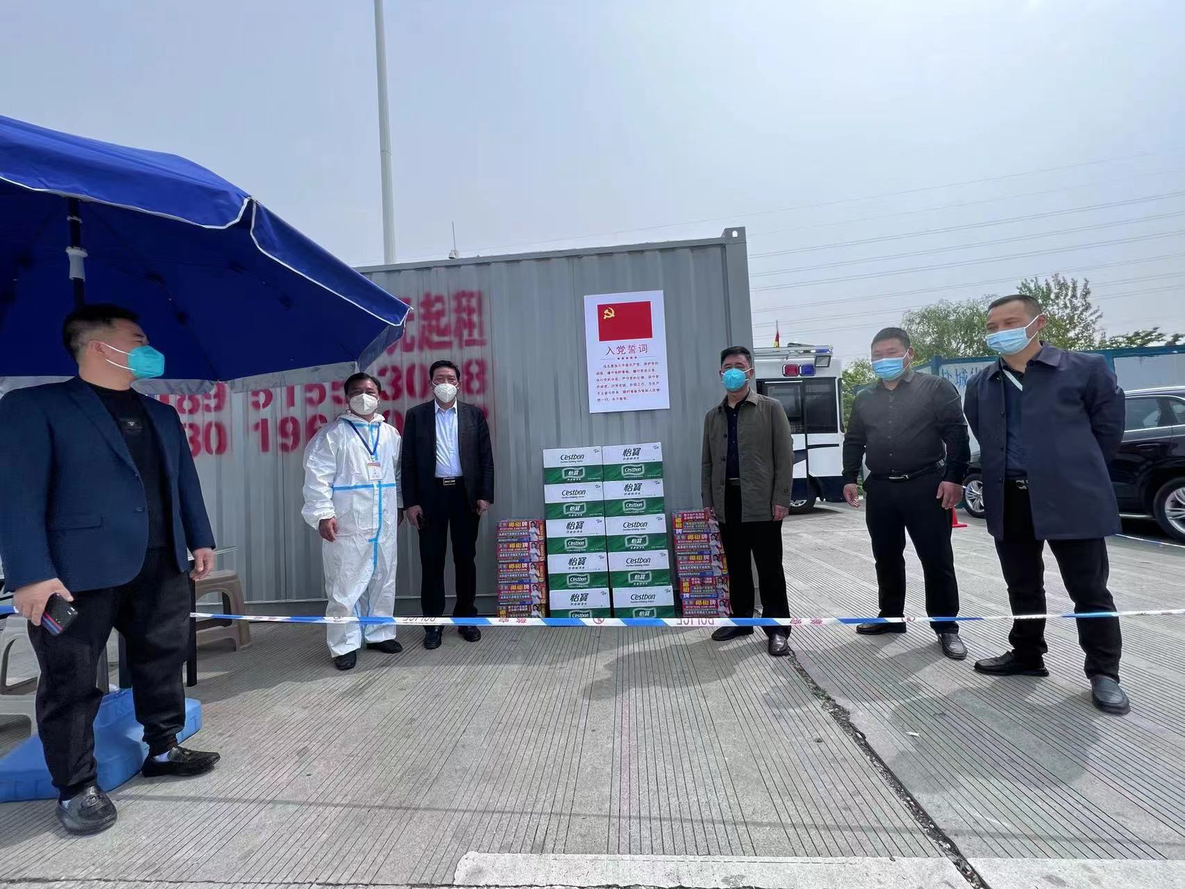 4月22日下午,盐城荣烨水产品批发有限公司负责人汪草来到盐城西高速卡口值守点,向我局奋战在疫情防控一线的工作者表达敬意,送去问候,为他们送去矿泉水、方便面、红牛等慰问品。