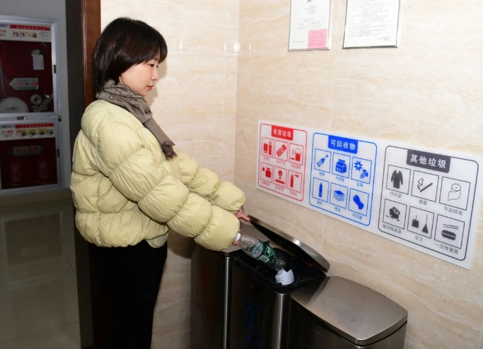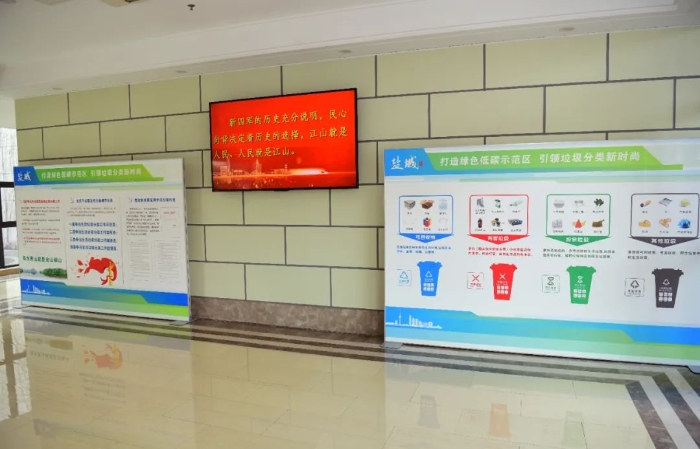 盐城市委党校在大楼各层设置宣传牌,在教学间隙播放生活垃圾分类宣传片,通过沉浸式教学,提高学员垃圾分类的意识。