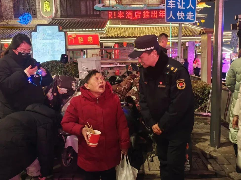 2月12日晚7时左右,水街人流量进入高峰,在来回穿梭的人流中,一位六十多岁的老人独自在开放大道盐镇水街东门前来回徘徊且情绪低落。正在水街元宵节灯会执勤的市城管行政执法支队三大队卞庆琪同志敏锐察觉到异常,主动上前询问老人是否需要帮助,老人语言表达模糊,无法清晰说明自己的情况。卞庆琪同志立即将老人搀扶至执法车上取暖,并迅速向大队领导报告情况。