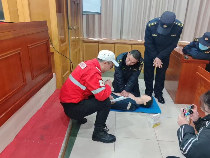 随后,培训进入了紧张刺激的现场实践演练环节。模拟突发心脏骤停情况,城管队员迅速响应,按照培训所学,规范、准确地完成了从发现、呼叫、胸外按压到使用AED除颤的全过程。整个演练过程流畅而高效,充分展现了城管队伍应对突发事件的快速反应能力和专业素养。