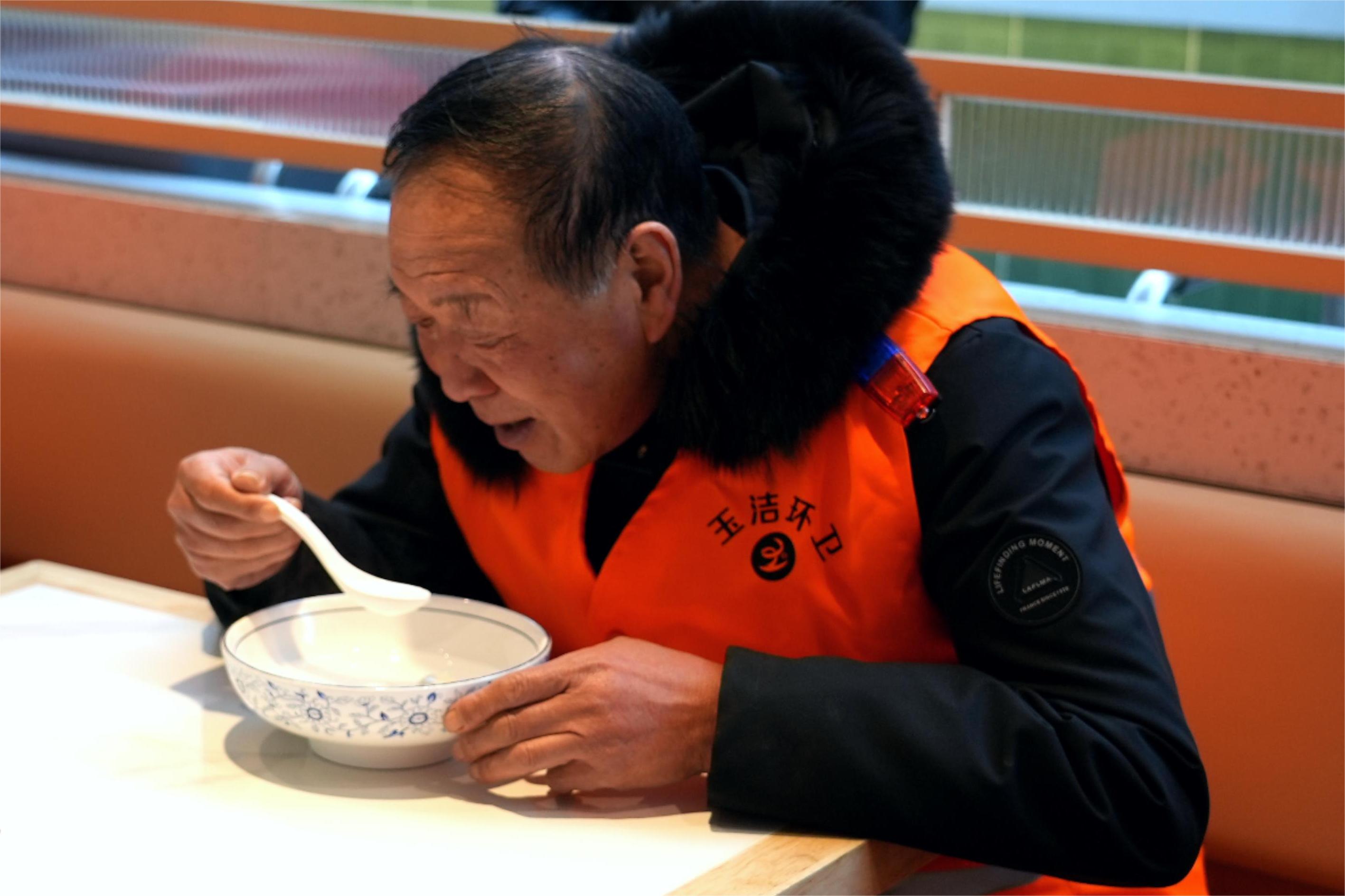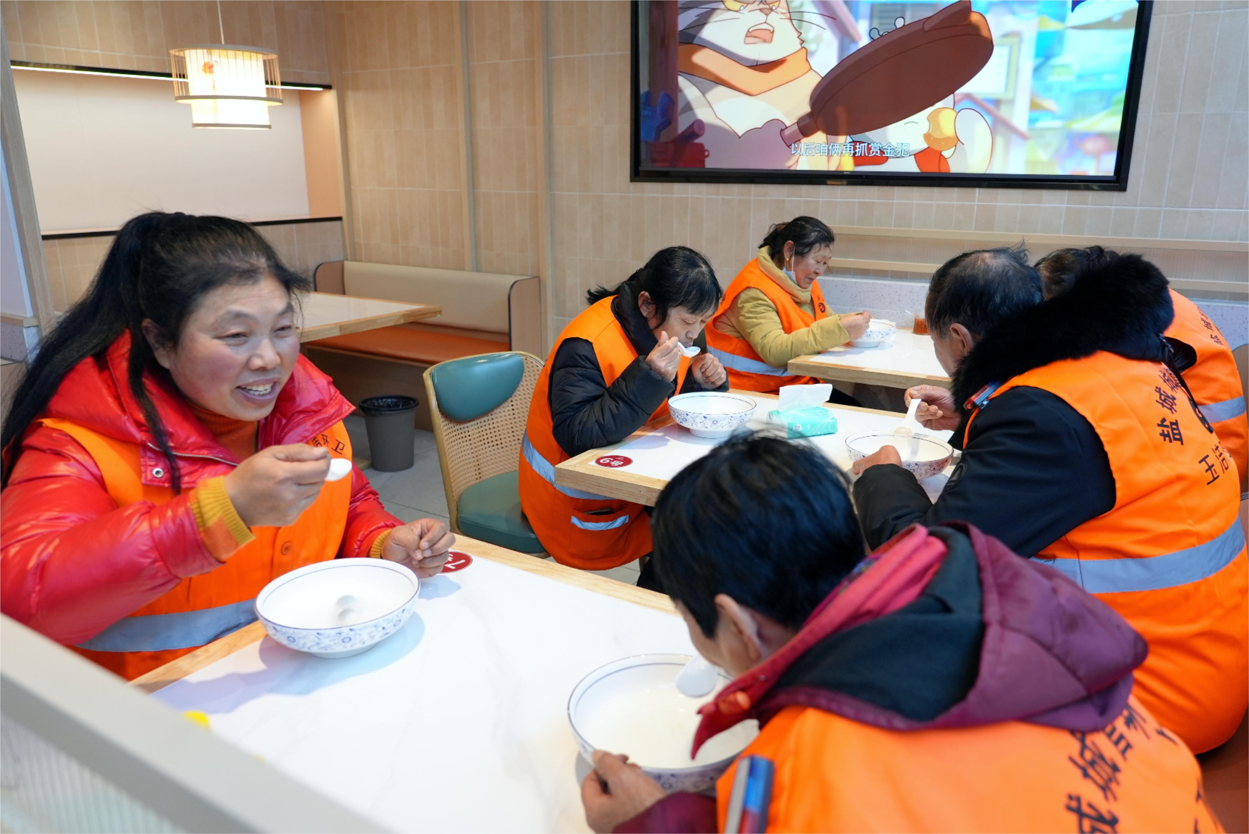 活动现场,永源放心早餐工作人员提前准备下汤圆,热情地将一碗碗热气腾腾的赤豆小圆子送到大家手中,并送上节日问候,还不时提醒“小心烫”。身着橙色工作服的环卫工人笑容满面,兴高采烈地有序排队领取,接过汤圆时连声道谢。朴实的话语、香甜的汤圆,让环卫工人感受到浓厚的节日氛围。